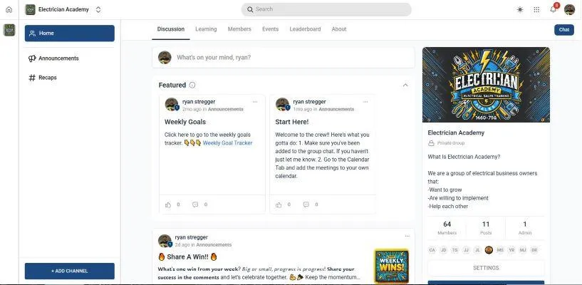 Electrician Academy is our community of motivated electrical business owners just like you. The point of the group is to surround yourself with like minded individuals that are also motivated to grow. A rising tide raises all ships, as a team we will succeed! Electrician Academy is access to a group where you can post and answer questions about business. You also get access to our active group chat where you can talk with other business owners just like you. And finally, we have Monday morning huddle where we meet on video call to get pumped up for the week!!